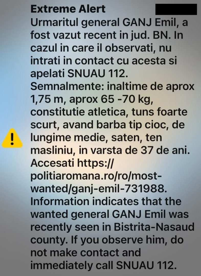 Alertă la nivel maxim în județul Bistrița-Năsăud, unde ar fi fost văzut Emil Gânj. Autoritățile au dat un mesaj RO-Alert, iar echipajele de poliție opresc toate mașinile care se află în tranzit, verifică portbagajele, iar în cazul dubelor este verificat și spațiul de depozitare. A fost verificat chiar și un tren care are haltă în zonă.