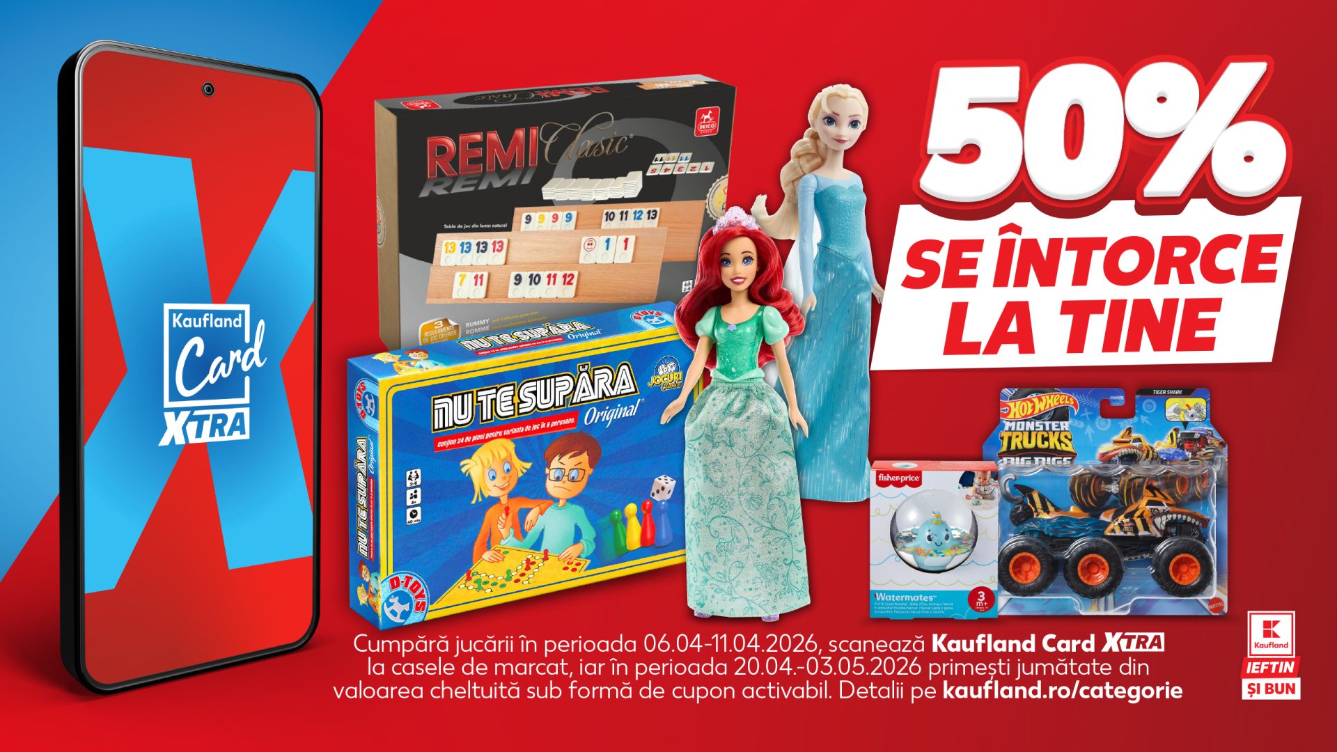 Iată cum funcționează, mai exact, campania Kaufland: jucăriile se achiziționează la preț întreg, iar la casa de marcat se scanează cardul de client, urmând ca 50% din valoarea acestora să fie returnată în aplicație, sub formă de cupon. Cuponul poate fi utilizat ulterior, în perioada 20 aprilie – 3 mai, iar valoarea maximă acordată este de 500 de lei.