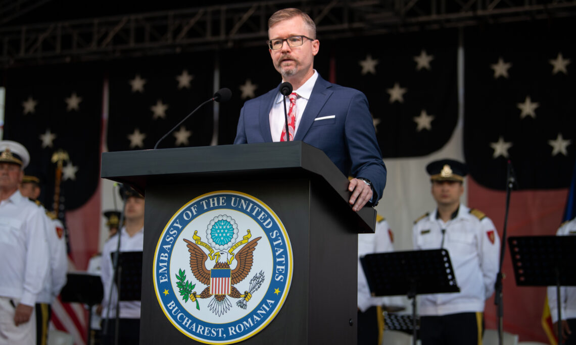„În această seară, sărbătorim nu doar fondarea Statelor Unite ale Americii de acum 249 de ani, ci și spiritul american durabil al libertății, prieteniei și valorilor comune care leagă națiunile între ele – inclusiv legătura specială dintre Statele Unite și România.