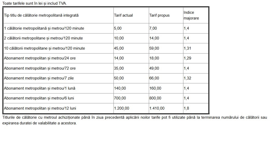Biletele metropolitane de călătorie din București, STB plus Metrorex, s-ar putea majora cu 1,4%, ajungând să coste 7 lei, potrivit datelor publicate de Ministerul Trasporturilor, care a pus în dezbatere publică ”Ordin al ministrului transporturilor și infrastructurii pentru modificarea și completarea Ordinului ministrului transporturilor și infrastructurii nr.1026/2021 privind aprobarea tarifelor de călătorie cu metroul”.