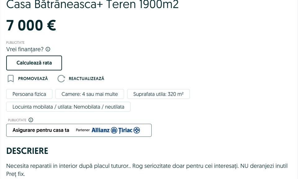 Localitatea unde poți cumpăra o casă cu doar 7.000 de euro este Brăila. Potrivit unui anunț postat pe o platformă dedicată vânzărilor, proprietarul a specificat că prețul este unul fix și că își dorește seriozitate de la viitorii potențiali cumpărători.